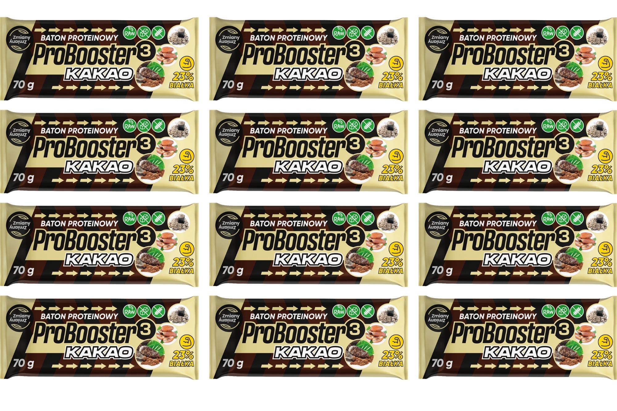 W kartonie znajdziesz 12 batonów proteinowych ProBooster 3, każdy o wadze 70g.