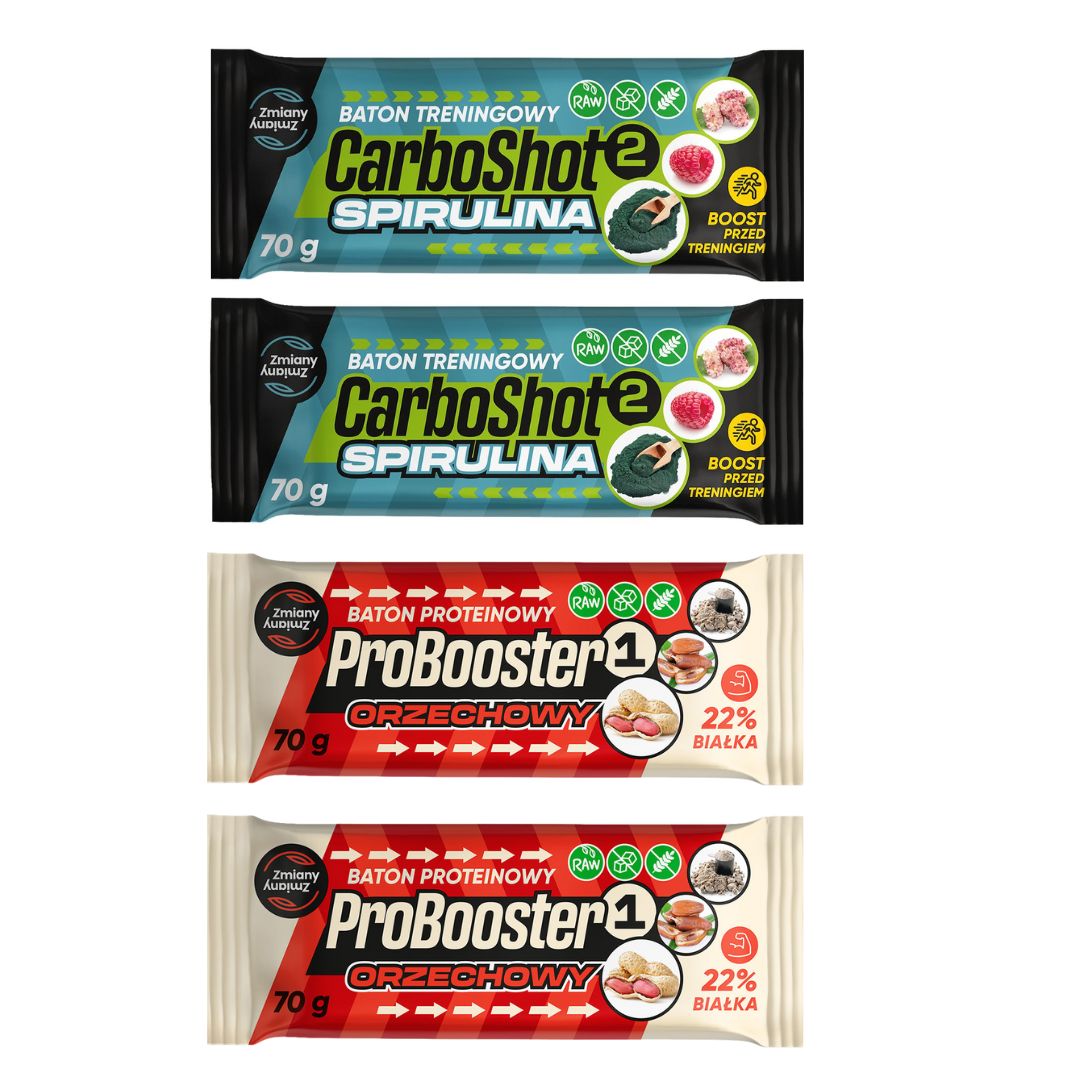 - 2 batony przedtreningowe CarboShot 2 spirulina (wcześniej Petarda) - spora dawka przedtreningowych węgli!